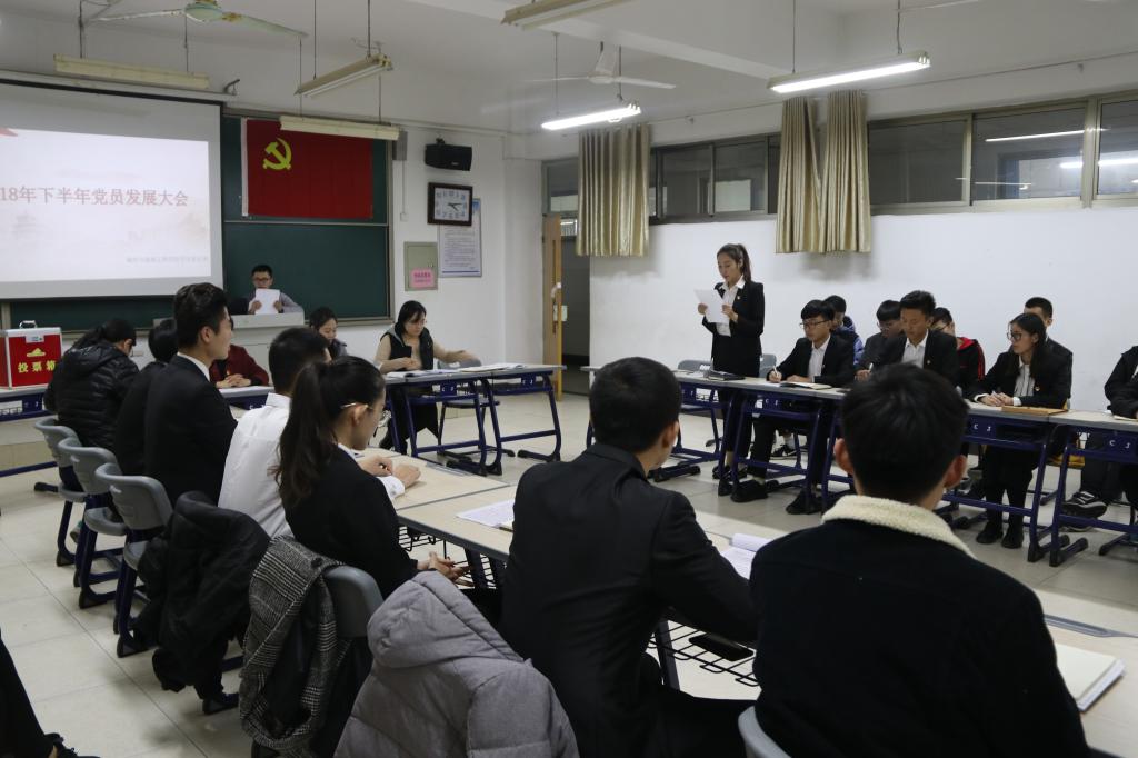 本次会议内容分两项:党员纳新及预备党员转正。大会开始,由四位预备党员依次表明入党动机和他们要加入中国共产党的强烈愿望。接着,五位申请入党人逐一进行入党志愿书的宣读以及自己的入党动机。申请入党的同学都真情的表达了对党的向往,对党的忠诚,表示坚定不移跟党走,为党的工作付出自己的力量,为共产主义奋斗终生。老师们对发展预备党员寄予希望,鼓励他们随时与党中央保持一致,为同学服务,做员工表率,加强自我要求。各入党介绍人对申请入党人的学习、工作、实践活动等方面进行了全面的评价,对其政审情况提出意见。所有党员进行讨论并充分发表各自意见,申请人再次表明态度后,拥有表决权的党员对接收党员与预备党员进行了投票表决,最终通过了转正党员转为正式党员,发展对象正式成为预备党员。