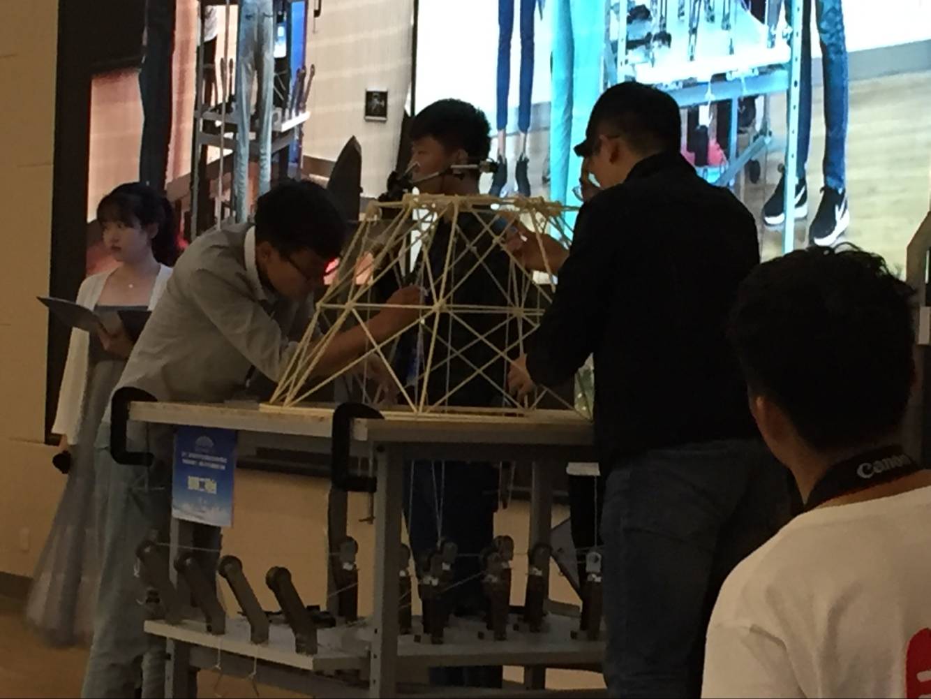 本次大赛,有来自山东大学、哈尔滨工业大学(威海分校)、中国石油大学、青岛理工大学等28所省内高校的31只队伍参加。公司由赵澄、张耀、贾传奇三名同学组成的队伍在袁下下、李晓明老师指导下参加了比赛。竞赛以“承受多荷载工况的大跨度空间结构建模设计与制作”为赛题,模型采用竹质材料制作,并在加载现场施加一级、二级竖向荷载和三级水平荷载来考验结构模型的挠度和承载能力。评委对各参赛队在设计计算、结构选型与制作质量、现场表现、模型承载力、模型刚度五个环节中的表现分别评分,最后由组委会来综合评定各队总得分。公司作品“简约”成功通过了一级竖向荷载40KG、二级最大竖向荷载24KG和三级最大水平荷载8KG后完好无损。据统计,其中31个比赛作品中有1/3的作品在没达到要求承载荷载前模型已破坏。