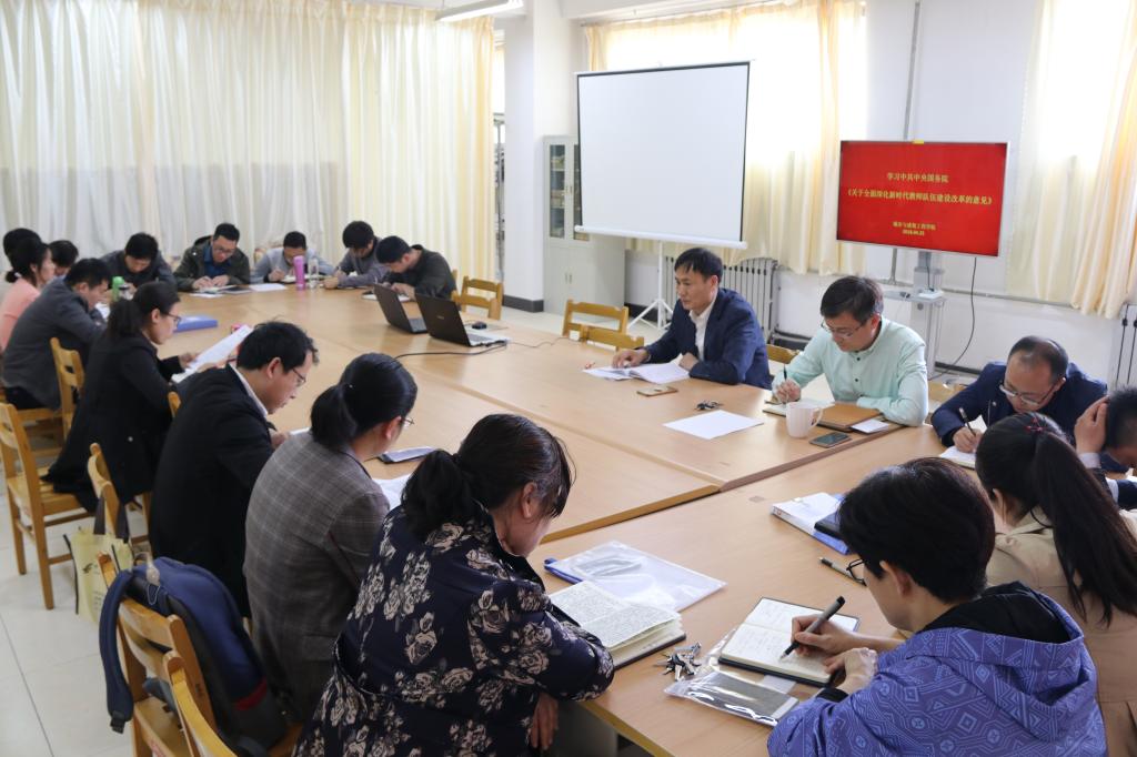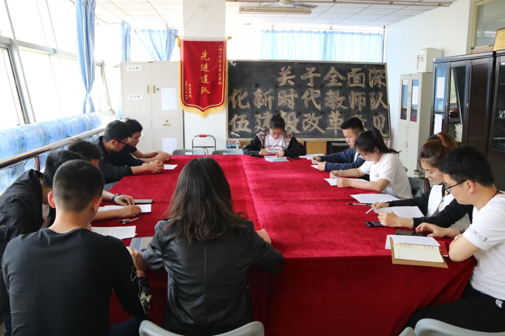 会议由徐鸿飞、杜珊珊同志分别带领本党支部全体党员学习了《关于全面深化新时代教师队伍建设改革的意见》的文件精神。各位党员同志一致认为《意见》是习近平中国特色社会主义新时代为教师队伍建设改革带来的前所未有的机遇,是凝心聚力推进教师制度改革的集结号,也是广大教师深切期盼的福音。《意见》全面阐述了深化教师队伍建设的战略意义、指导思想、基本原则、目标任务,并从师德师风建设、教师专业素质提高、管理制度改革、教师待遇及保障措施等方面提出了一系列政治举措。学习讨论后,党总支书记李振清同志认为各位党员会后需深刻学习领会《意见》精神,要以习近平新时代中国特色社会主义思想武装自己,以文件精神为导向,全面提升个人素质能力,以德立身、以德立学、以德施教、以德育德,抓住新时代教师队伍改革的新机遇,争做“四有”好教师,全心全意做员工锤炼品格、学习知识、创新思维、奉献祖国的引路人。