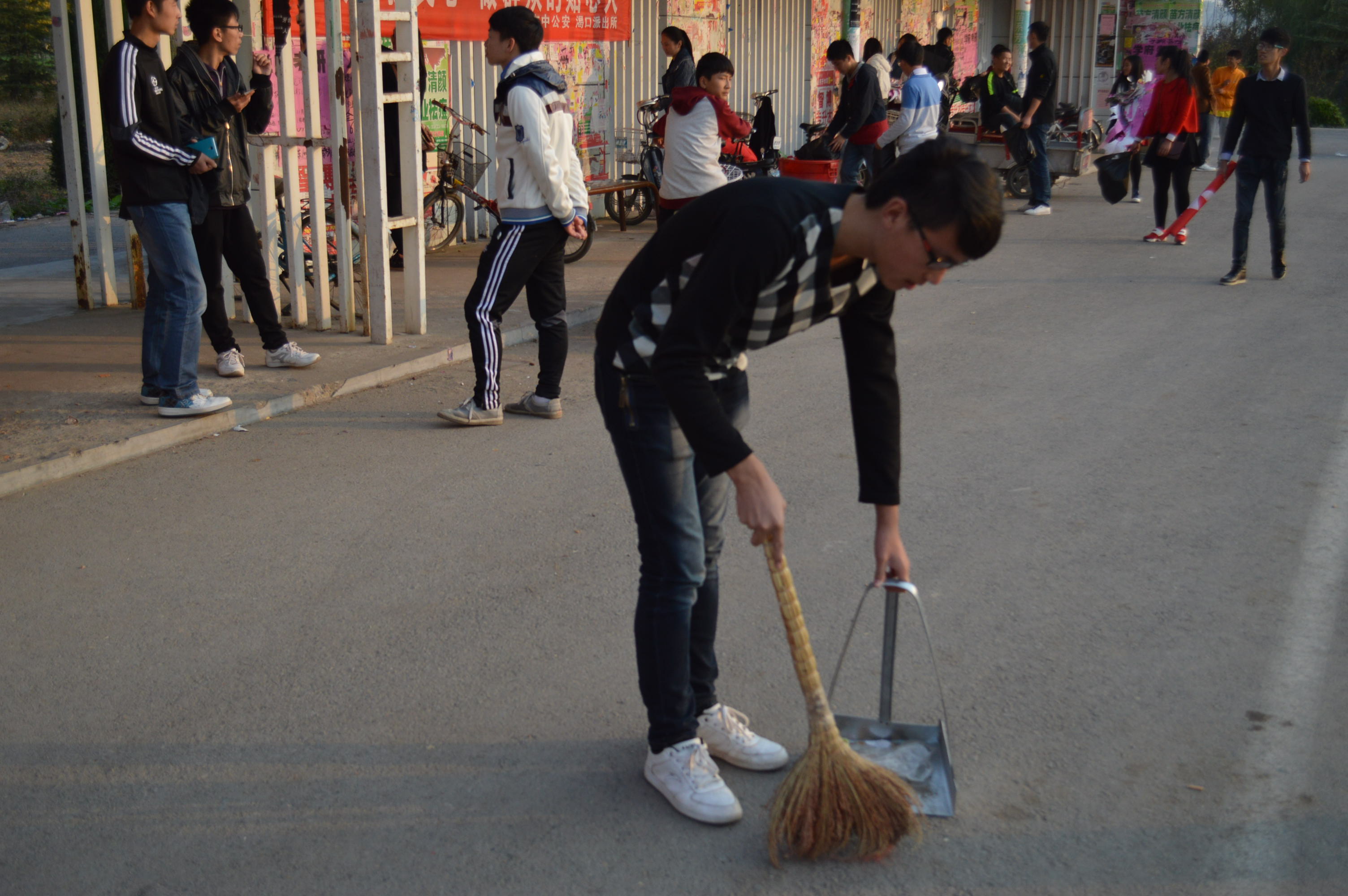 活动伊始,卫生部部长发言,强调保护环境是老员工义不容辞的责任,保护环境不是三分钟的热度,需要我们从日常小事做起,长久的坚持。我们牢记的不仅仅是相册里的美丽图片,而是我们身边和谐的环境。然后同学们分组开始义务清理校外垃圾,同学们用精心准备了白色环保袋按照既定路线开始清扫垃圾,对地上的饮料瓶,被随地乱扔的零食包袋,烟头和纸屑,悉数被大家收入垃圾袋,在经过大约三个小时的清扫后,地面焕然一新。