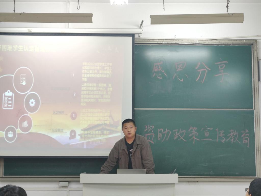 为切实了解资助政策,进行宣传教育,2020级全体同学于4月6日下午六点半,在各自班级召开了“感恩分享、资助政策宣传教育”主题班会。会议由各班班长主持。