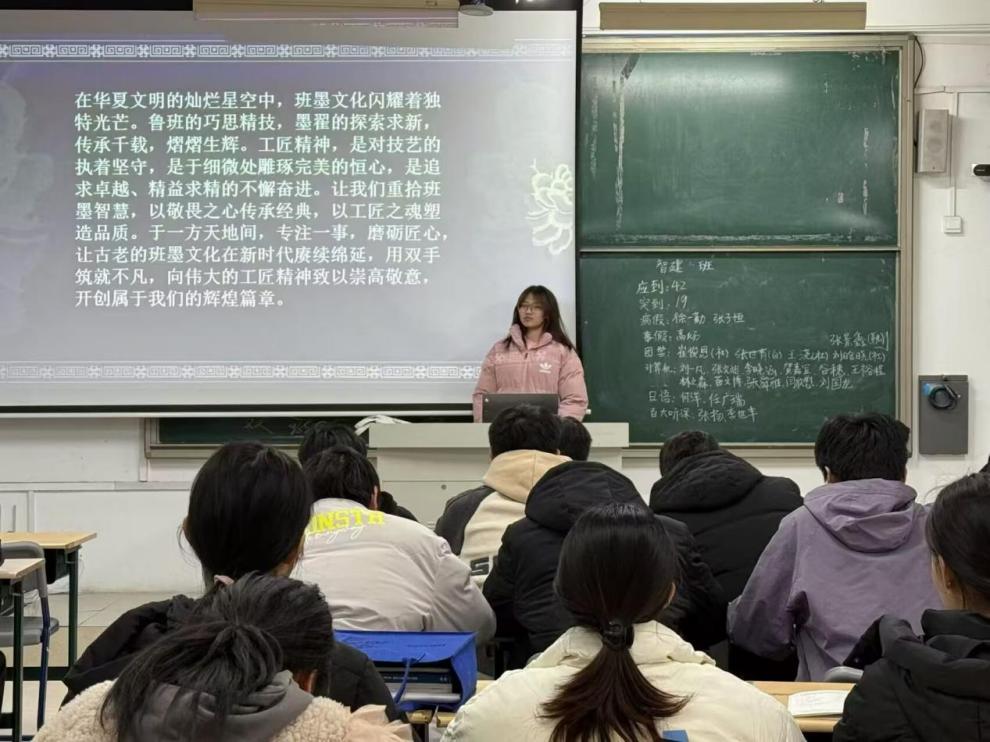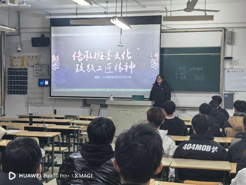 各班团支书详细介绍了班墨文化的起源与发展,墨子的“兼爱非攻”、鲁班的精巧技艺。在交流讨论环节,同学们积极发言,表示今后会更加严谨认真地对待学业,不怕吃苦、持之以恒地打磨专业技能,为未来职业发展筑牢根基。